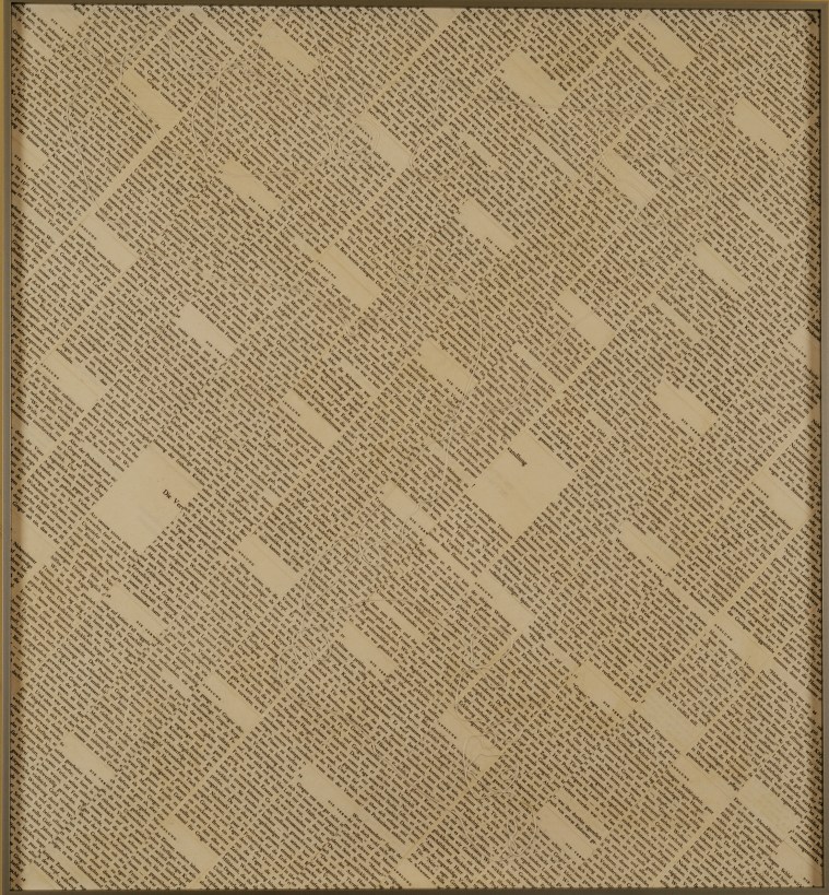 Here are two pieces using the text of Franz Kafka’s story, The Metamorphosis. I started with a bilingual German/English edition (Schocken Books, 1968) so that I wouldn’t loose text on the verso of each page. Then I cut the text in to blocks and arranged them in geometric patterns. These two examples use traditional parquet floor patterns as the basis for a depiction of Gregor Samsa’s nightmare. Overlaid on the text-as-floor is another pattern made of white string. It is really hard to see the string pattern in these photos (while the bottom piece is too yellow, you can see the thread more clearly).