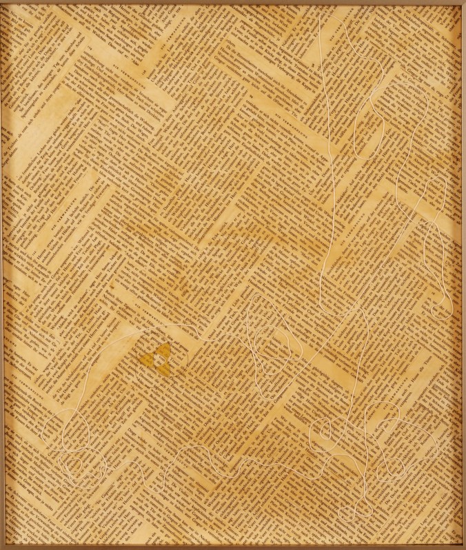 Metamorphosis (Double Herringbone Pattern) (2011) 17X19″, book pages, gouache, and string.