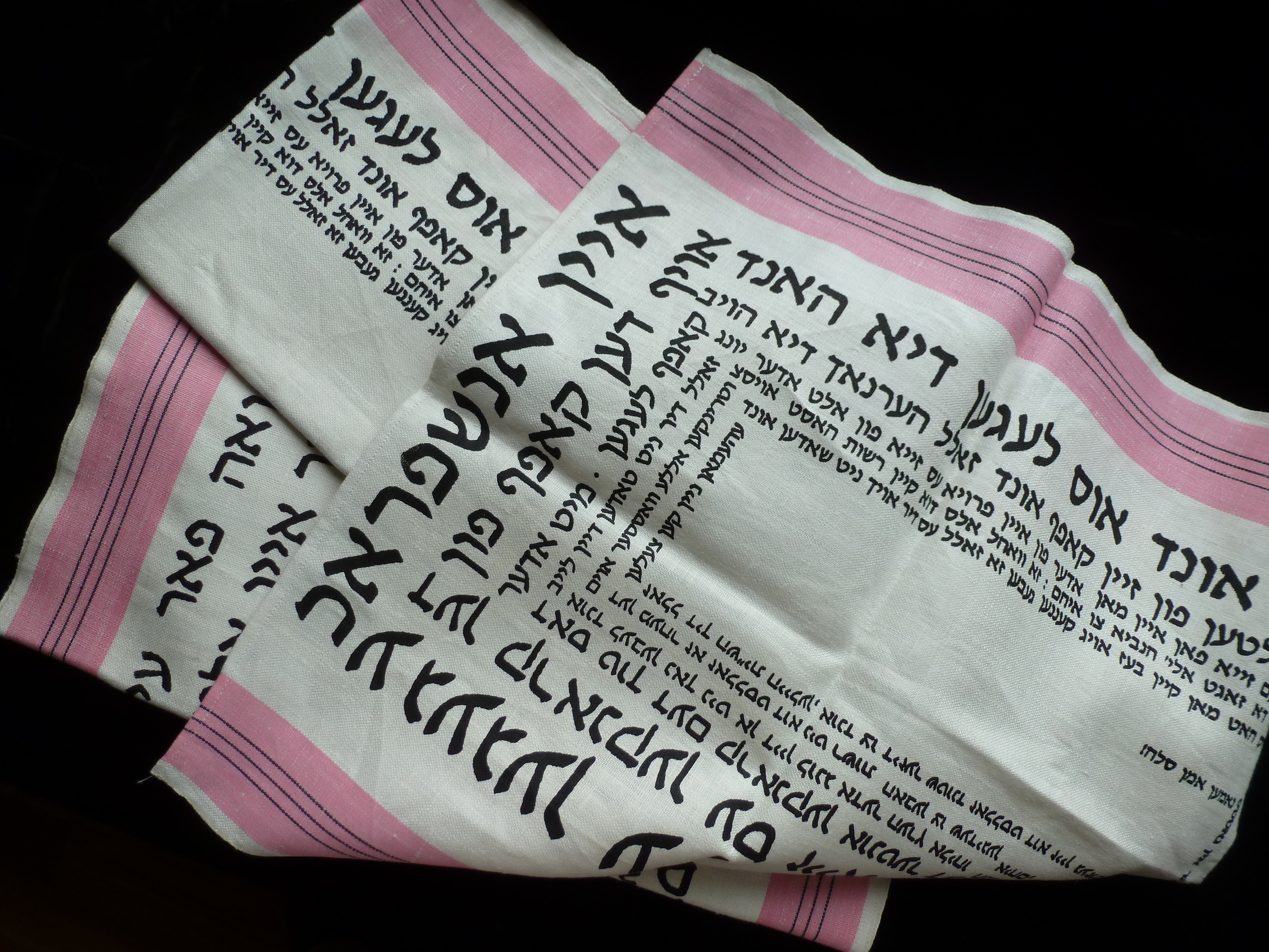 This is a project from last fall, a set of 5 linen dish towels. The towels are screen printed with an 18th century tkhine, a vernacular form of prayer made by Jewish women. As in many religions, some forms of Jewish women’s religious practice are vernacular, i.e. specific to a locality of practice rather than canonical learning or formal liturgy. In this sense, the tkhine is akin to other types of belief practices women perform all over the world, activities rooted in the locations and realities of everyday life rather than the formal confines of a synagogue/mosque/church/temple from which women are often exempt or excluded.
