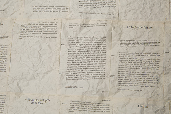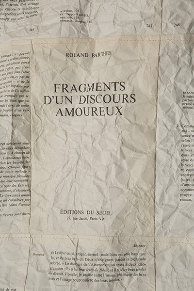 Coverlet: A Lover’s Discourse (2013). 54×82″ Book pages, quilt batting, cotton fabric, thread, and satin binding tape.