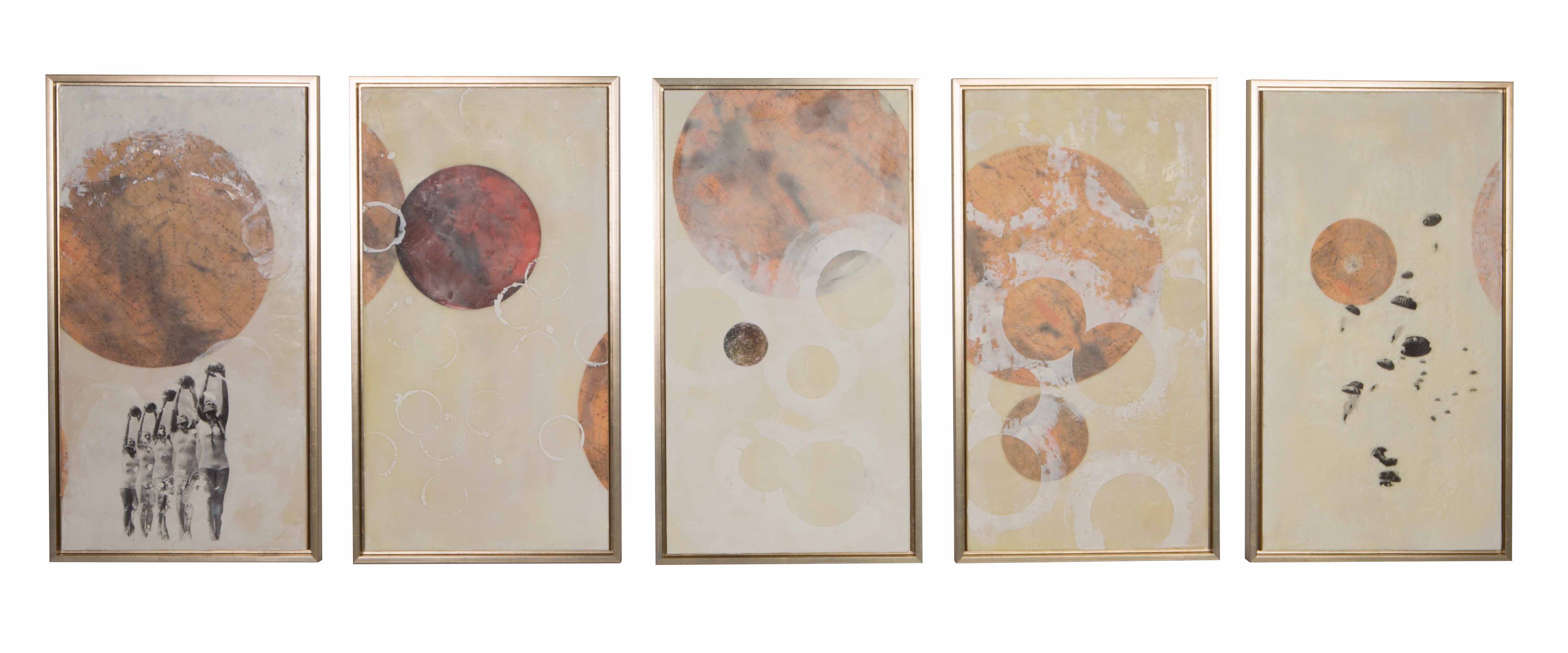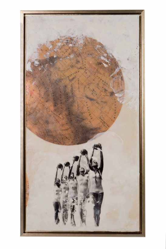 Mars, mein lieben (2014) is an encaustic pentaptych with embedded collage and image transfer. Here I have used maps of the planet Mars with re-purposed images from Hitler youth propaganda to reflect on the duplicitous romanticism of war. 25 x 68 inches total.